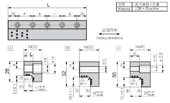 JSL铜基自润滑滑块,结合了铜合金(ZCuZn24Al6)的耐磨性及固体润滑剂的自润滑性能,使其在使用过程中无需加油维护。
