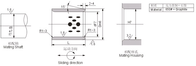 JDB-650铜基固体镶嵌式自润滑轴承,结合了铜合金(ZCuZn24Al6)的耐磨性及固体润滑剂的自润滑性能,使其在使用过程中无需加油维护。产品被广泛用于高载、间歇性或摇摆运动,如汽机车生产流水线、水轮机、水库工作/事故门、塑胶机械等。根据使用的工况,可以提供各种类型的铜合金。