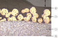 1. 改性聚甲醛(POM)及铅的混合物0.3~0.5mm, 具有很高的耐磨性能,甚至在瞬间缺油的情况下也具有较低的摩擦系数。轴承表面有排布规律的带有螺旋角度的储油坑,装配时,必须涂满润滑油脂。 2. 铜粉层0.2~0.3mm,具有很好的承载能力和耐磨性,良好的导热性能可及时转移轴承运作过程中产生的热量。复合材料可渗入到铜粉球的间隙中,提高了结合强度。 3. 低碳钢0.4~2.2mm,提高轴承的承载能力和热转移作用。 4. 铜/锡电镀层,铜镀层0.008mm,锡镀层0.005mm,使轴承有很好的耐腐蚀功能。 | |